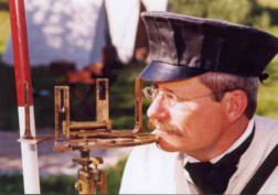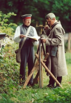 Es werden zwei Gehilfen für die Meßkette und den Transport der Instrumente benötigt. Der Geometer Johann-Gottfried Schmitz liest die Winkel ab und