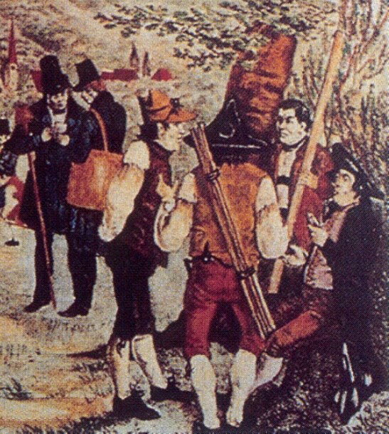 Im Vordergrund: Rechts und Links die Gehilfen als Instrumententräger, Gehilfe im Hintergrund mit Nivellierlatte oder distanzmessender Latte, der Vordermann mit den auf den Rücken geschnallten Kettenstäben.(Würrtemberg. Landesaufnahme, Gasser, 1830)