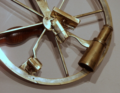 (hier leicht verdreht) wird das 1. Objekt am 1. Spiegel vorbei erfaßt, gleichzeitig wird das 2. Objekt durch die beiden Spiegel beobachtet und mit dem 1. Objekt grob zur Deckung gebracht. Die Alidade wird festgeklemmt.