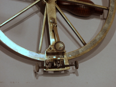 Genauigkeiten bis zu einer Minute möglich wären. Die Lupe erleichtert das Ablesen, nachdem die Alidade am Limbus festgeklemmt und die genaue Position mittels Mikrometerschraube fixiert worden