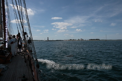 an Steuerbord in passender Entfernung für das kurze Gesicht des Navigators.