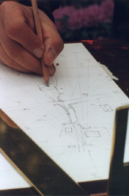 der Visurlinien auf dem Brouillon. Der Standort am Haus Mannesmann ist mit einer Nadel markiert.