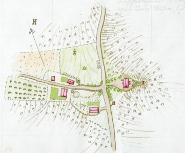 Eine Karte der Baugruppe im Maßstab 1:1000. Die festen Häuser und das Wegekreuz sind deutlich sichtbar.