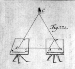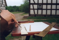 Einfache Meßtischaufnahme mit dem Diopterlineal (ohne trigonometrische Referenzpunkte): Ein Blatt von ca. 20” mit dem Maßstab 1:500 wird auf dem Tisch mit Knochenleim aufgezogen.