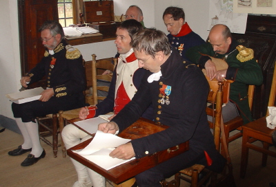 in der Stube des Hauses Rhinschenschmidthausen. Der vordere Capitain hält einen Skripturkasten auf den Knien.
