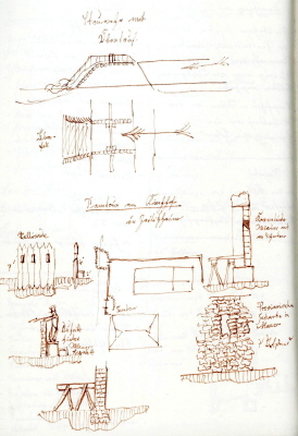 Oben ein Wehr mit Überlauf, welcher faschiniert wird.In der Mitte links Pallisaden für einen Tambour am Kirchhof.Unten Schützenauftritte, um über die Mauer oder durch Scharten schießen zu können.