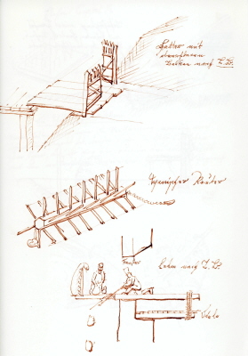 Der Übergang über einen Graben mittels abwerfbarer Bretter; der Zugang wird mit einem krenelierten Gatter