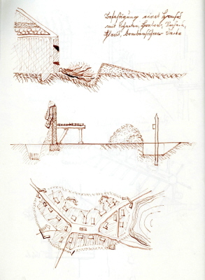 Oben eine Scheune, durch deren Fachwände Schießscharten geschlagen werden. Davor ein Graben mit Verhack und ein kleines Glacis.In der Mitte ein weiter Auftritt und eine Pallisade im Querschnitt.Die Befestigung eines Dorfes mittels Schanzen und Abati nach Blessons Feldbefestigung.