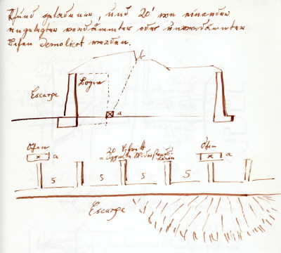 einer Escarpe (Futtermauer) eines Festungswerkes; die Öfen werden an den Fundamenten der Stützbögen in Abstand von 20-25' zum Springen gebracht.