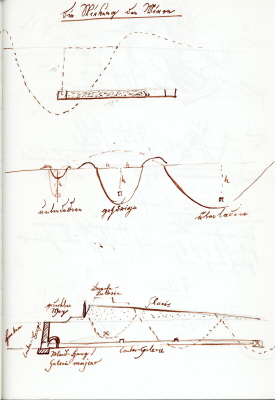 Unten der Querschnitt eines Konterminengaleriesystems, welches von der Konterescarpe, der Galérie Majeur (Mordgang) unter das Glacis führt.